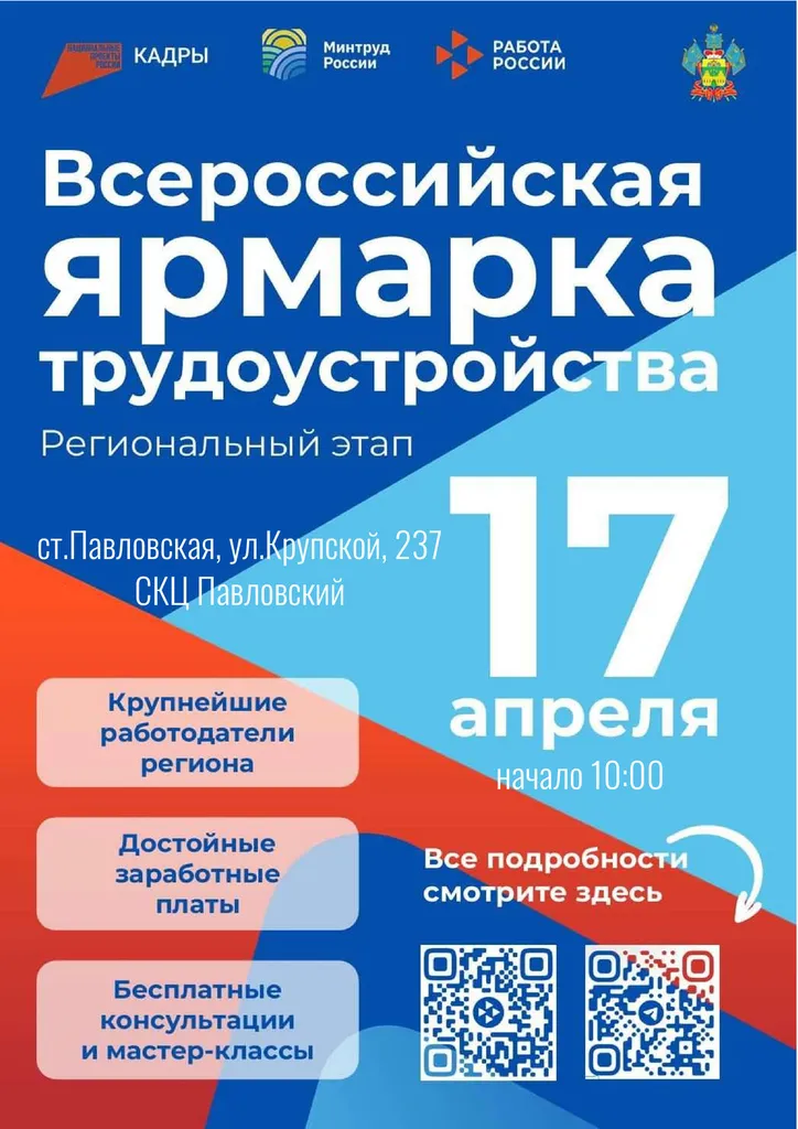 Филиал ГКУ КК ЦЗН Краснодарского края в Павловском районе информирует, что 17 апреля 2026 года по адресу: ст. Павловская, улица Крупской, д. 237 (здание социально-культурного Центра Павловского СП) пройдёт региональный этап Всероссийской ярмарки трудоустройства «Работа России. Время возможностей».